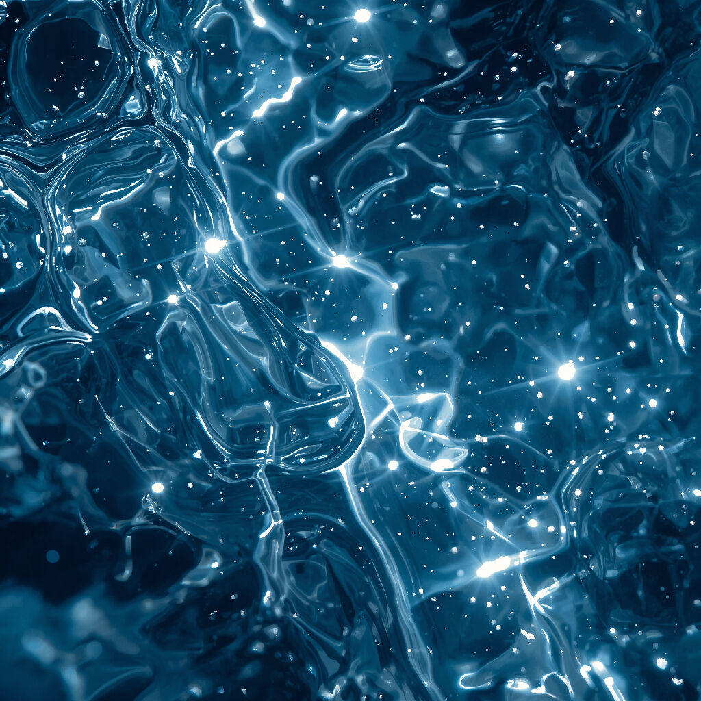 Fluid forms surge through deep blue space, creating organic sculptures from light itself. The composition captures matter in perpetual transformation, where liquid becomes luminous and substance dissolves into pure energy. Crystalline structures emerge and dissipate within the flowing medium, suggesting the fundamental impermanence underlying all physical reality. The interplay of transparency and opacity creates depth while maintaining mystery, as if viewing primordial creation through layers of time. The cool blue palette evokes both water and cosmos, uniting terrestrial and celestial elements. These flowing architectures of light speak to the dance between order and chaos that shapes all existence.
