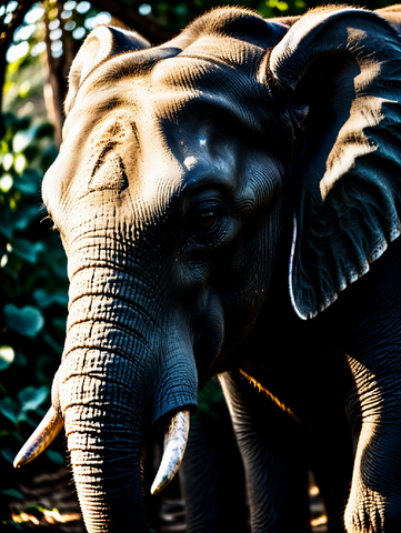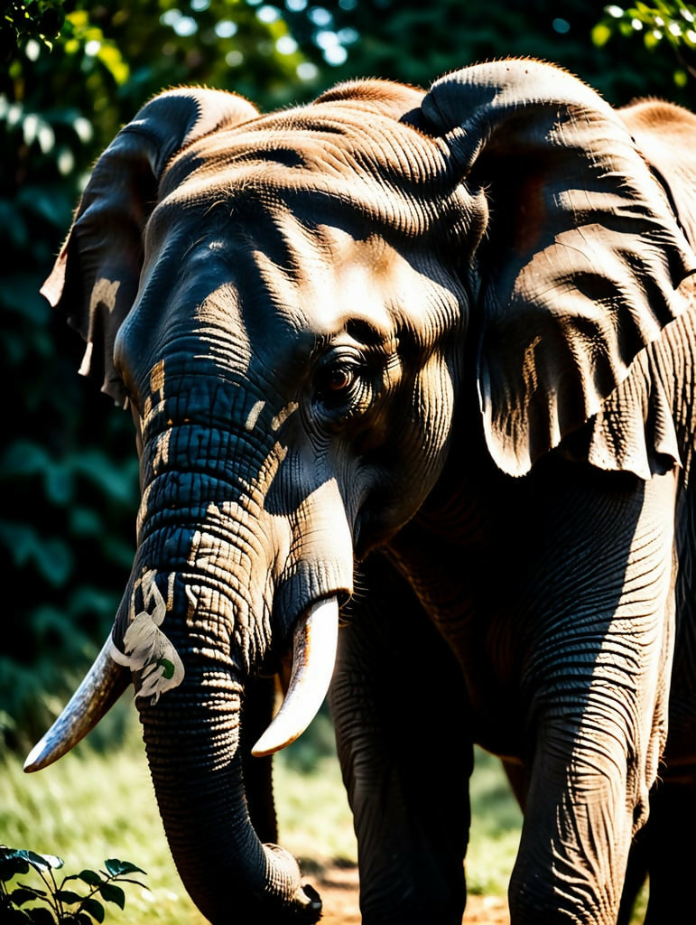 Elephant, Wildlife, Jungle, Forest, Portrait, CloseUp, Tusks, AfricanElephant, AsianElephant, WrinkledSkin, Texture, HighContrast, DramaticLighting, Sunlight, Shadows, Majestic, Power, Animal, Nature, Safari, Trunk, Ears, Wilderness, GreenBackground, Mammal, DigitalArt, AIArt, Photorealism, Rugged, Detail