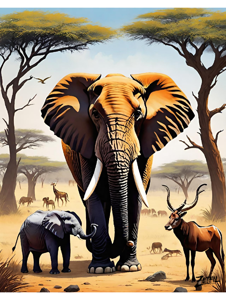 Cette peinture numérique vibrante vous plonge au cœur de la savane africaine, capturant la majesté d'un éléphant en gros plan. Avec une composition puissante, l'artiste met en avant le géant de la terre, tandis qu'un éléphanteau et d'autres animaux de la savane se tiennent à ses côtés, créant une scène de vie sauvage à la fois touchante et grandiose. Les couleurs chaudes et ensoleillées de la terre et du ciel contrastent magnifiquement avec la texture de l'éléphant, donnant à l'ensemble un réalisme saisissant.