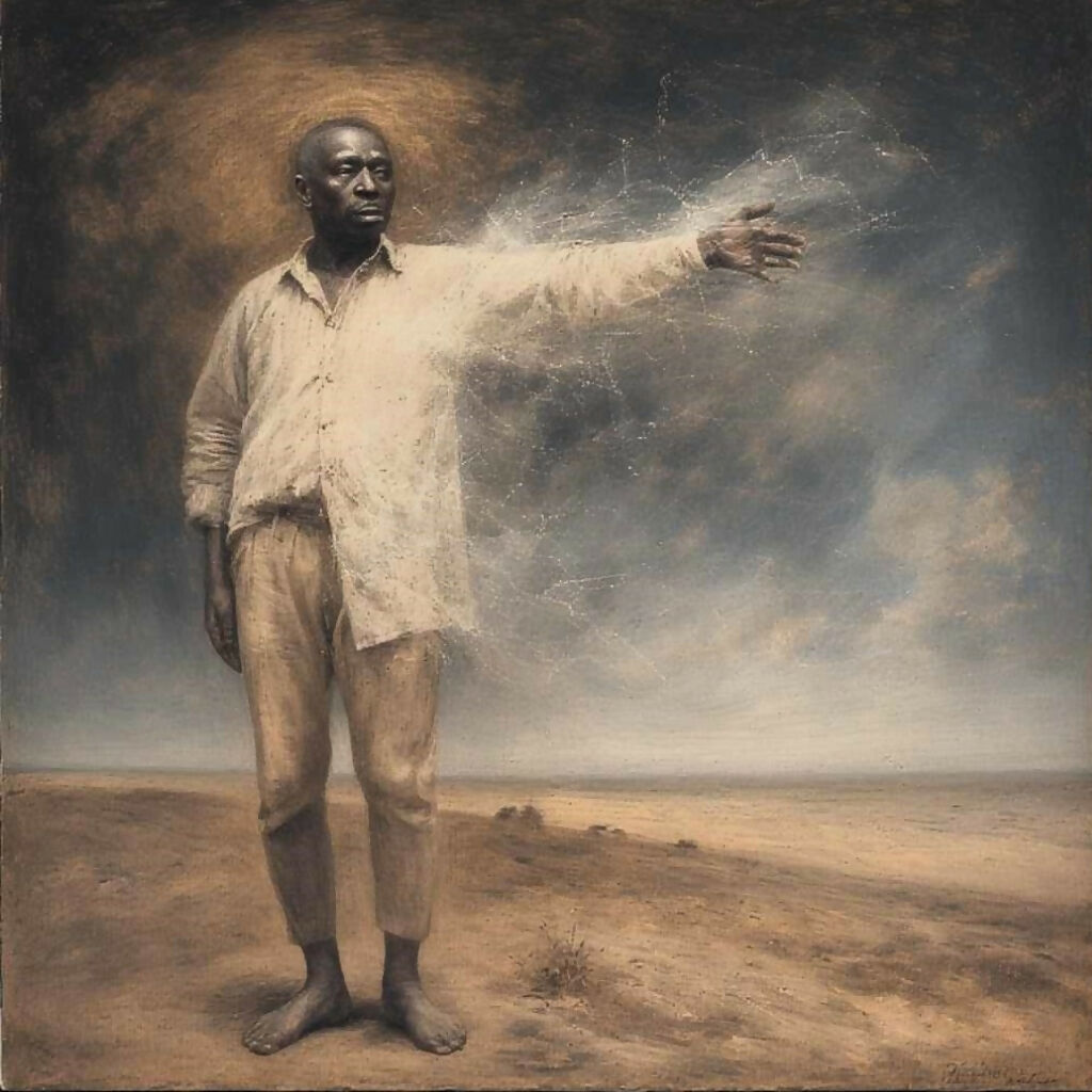 Elijah the prophet, a solitary figure, clad in a simple white shirt and tan trousers, stands unburdened by footwear upon a stark, desolate plain.