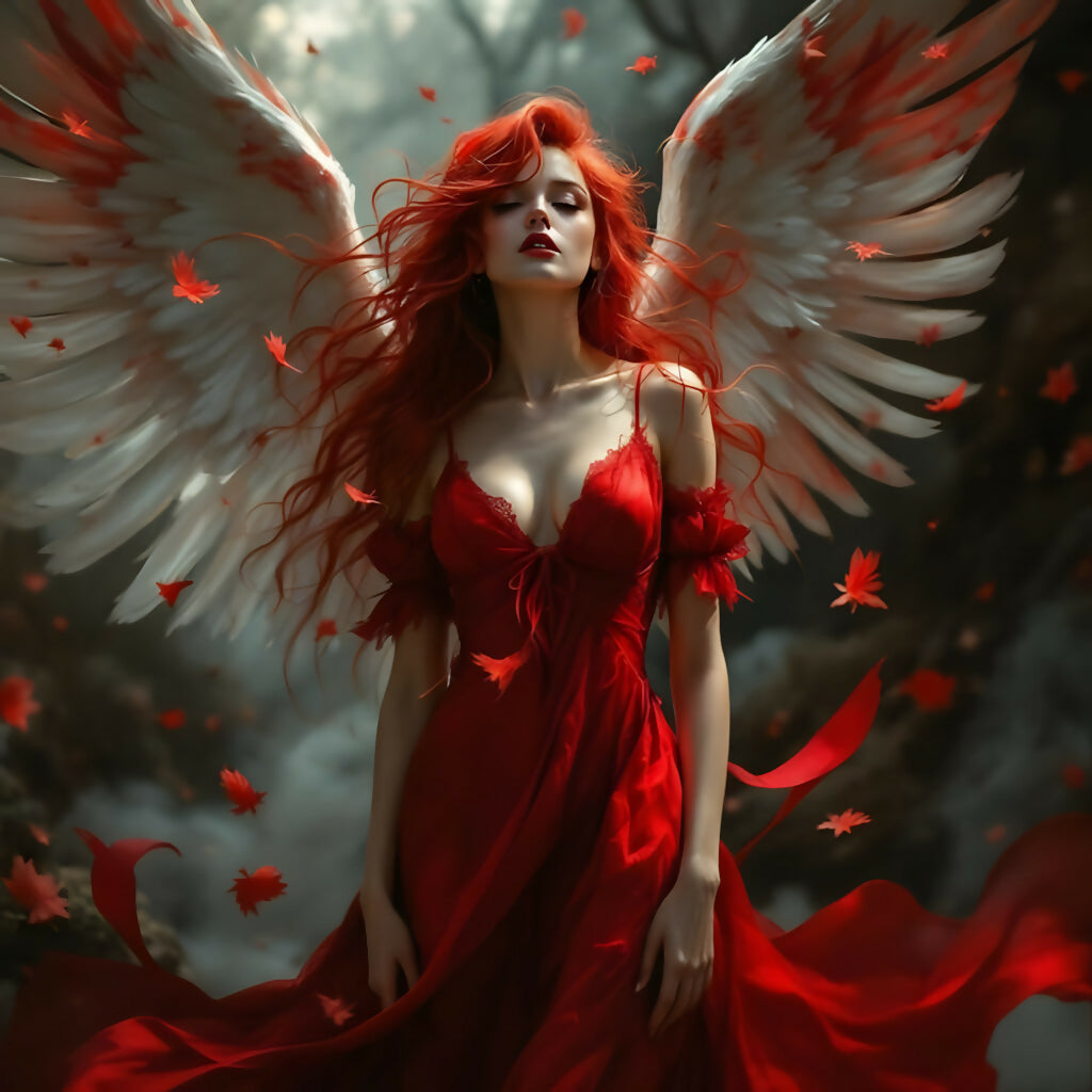Fierce and untamed, this angel rises from the heart of autumn like a flame in the shadows. Her fiery hair whips through the air, echoed by a gown of crimson that billows like smoke in battle. With white wings touched by red, and scarlet leaves swirling around her, she becomes the storm itself—passion, wrath, and beauty personified. A striking piece for lovers of powerful feminine imagery and dark fantasy elegance.