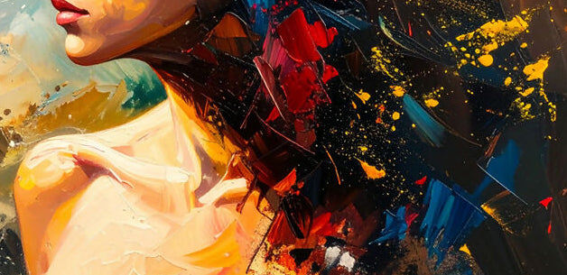 The background erupts with strokes of molten red, gold, and dusk blue,
