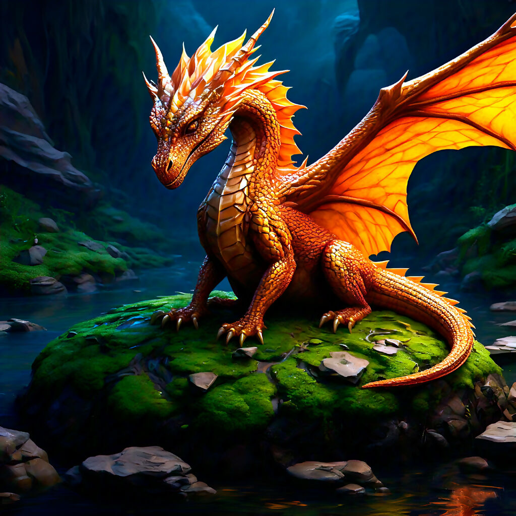 Step into a forgotten realm where myth meets nature. Emberwatch: The Guardian of the Glowing Canyon captures a rare moment of serenity as a powerful orange-scaled dragon perches atop a mossy rock, watching over a shimmering stream that winds through an enchanted canyon. With crystalline horns and glowing wings, this ancient sentinel radiates strength and wisdom. The artwork evokes a timeless legend—of a dragon who once protected the canyon’s secrets from intruders, only appearing when the moonlight turns the waters blue. This AI-generated masterpiece blends fantasy and realism, making it a striking addition to any collection that celebrates mythical landscapes and atmospheric storytelling.