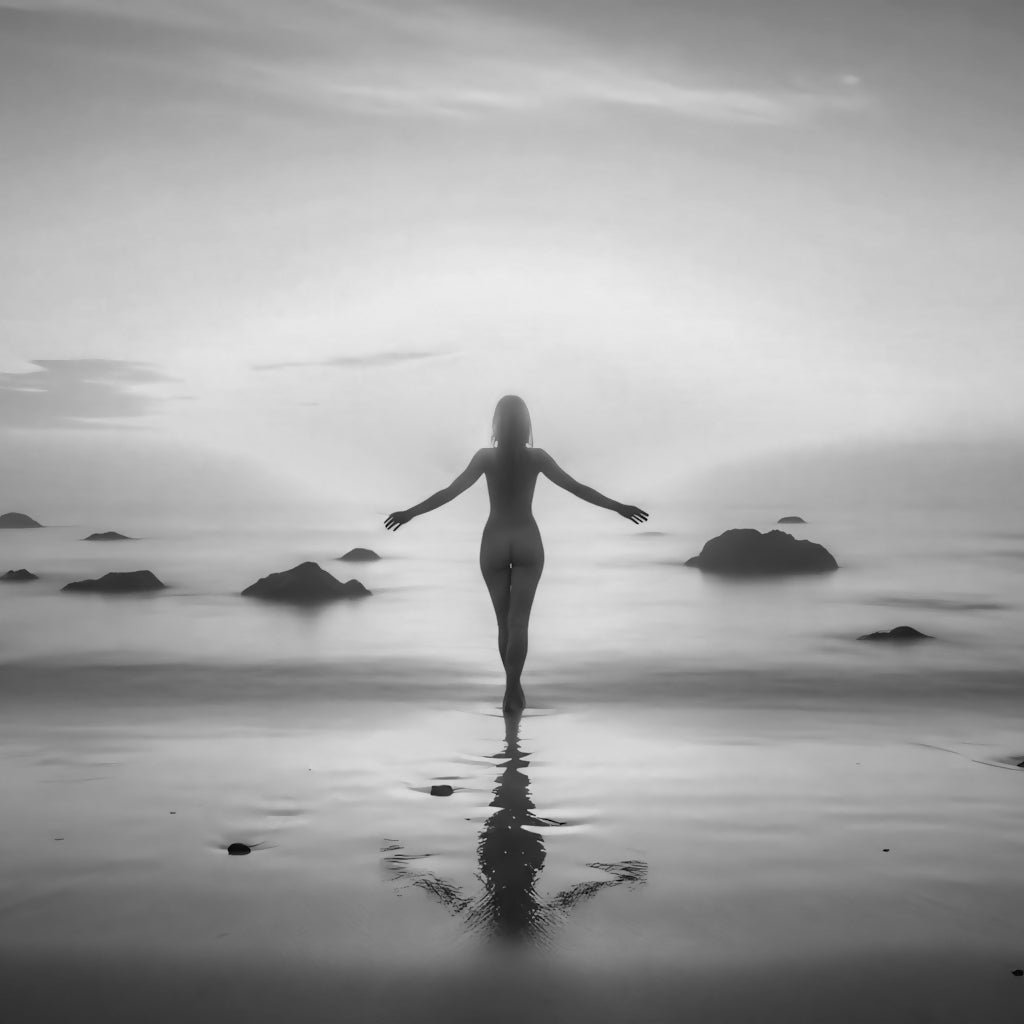 Beautiful black and white photo of a woman walking into the misty ocean with arms outstretched, perfectly reflected on the wet sand.