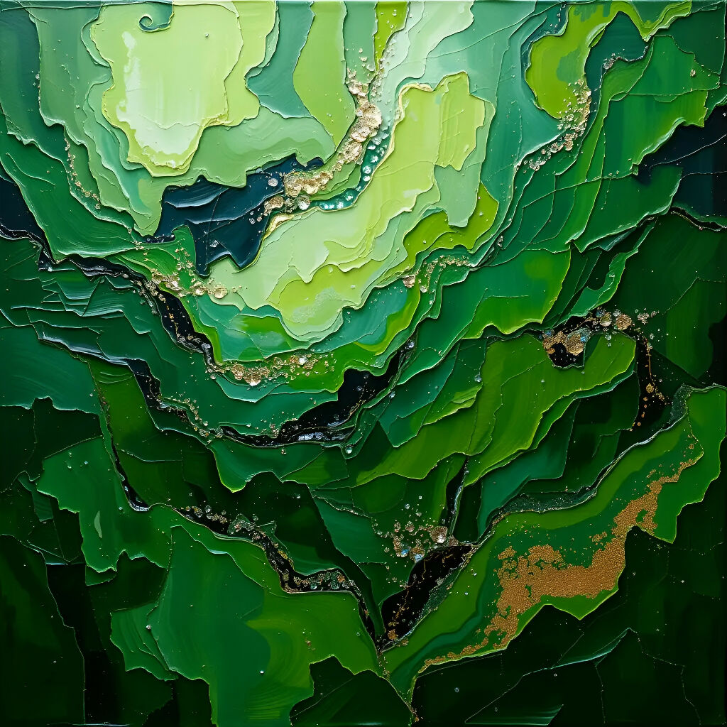 - Abstract image with flowing green and layered ridges, highlighted by gold flecks
