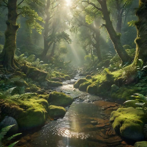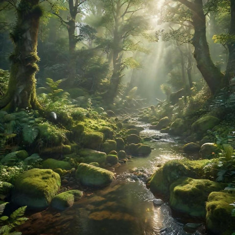 green forest, realistic nature, ultra-realistic, digital painting, photorealistic, forest stream, moss, sunrise, sunlight, mist, serene, tranquil, hyper-detailed, foliage, dewdrops, rocks, trees, cinematic lighting, high resolution, 8k, vibrant green, plants, jungle, tropical, mystical forest, wildlife, birds, butterflies, deer, fox, enchanted, natural landscape, forest floor, concept art, environment design, nature photography, meditation, calm, peaceful, morning light, forest scenery