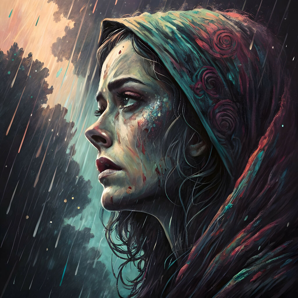 "Emotive Portrait in the Rain - Expressive Digital Art for Dramatic Wall Decor"