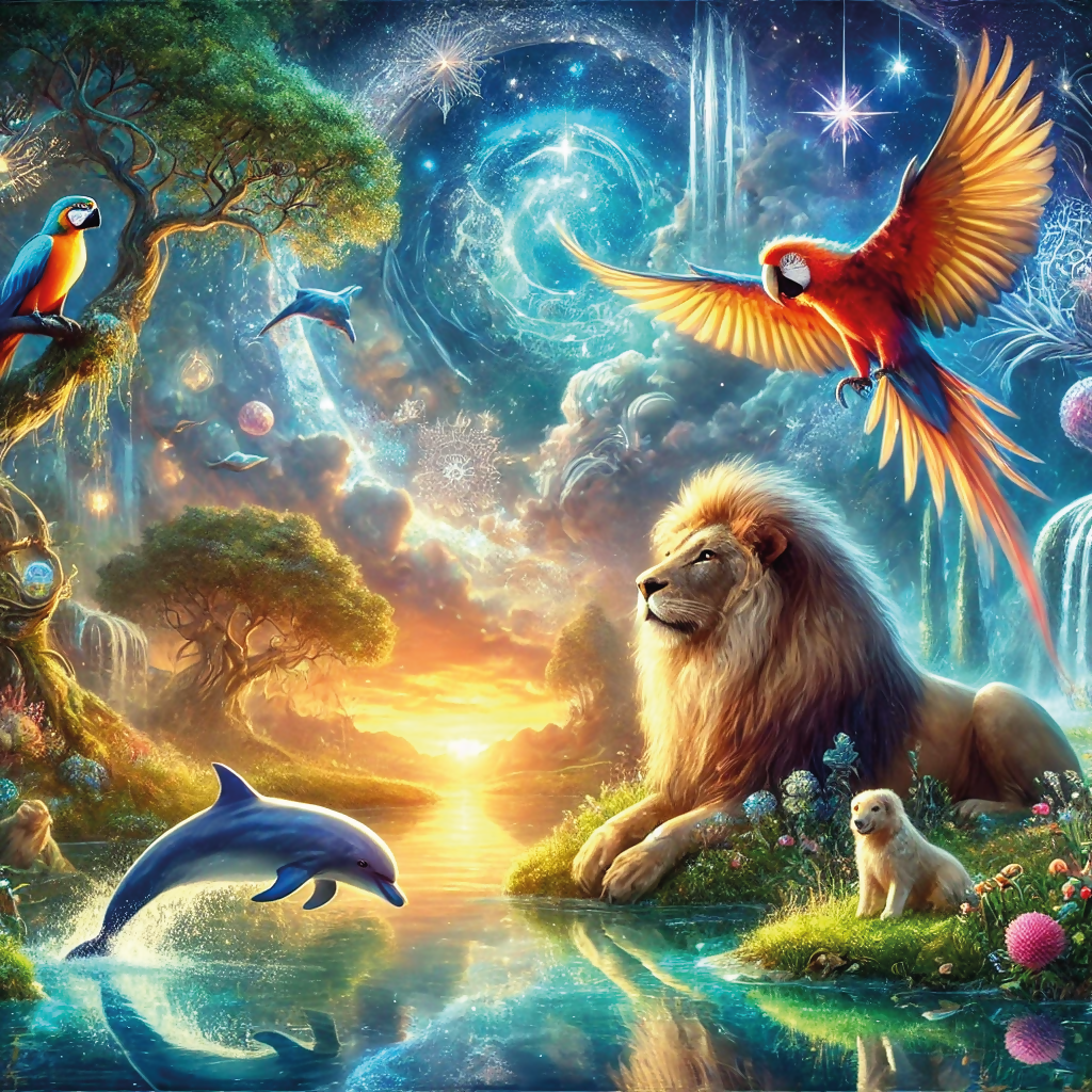 Step into a mesmerizing world where whimsical animals roam a vibrant fantasy realm. This enchanting artwork brings together majestic creatures amidst glowing, dreamlike scenery, featuring intricate details and radiant colors that evoke awe and wonder. Perfect for lovers of magical and surreal art, this masterpiece invites viewers to explore an extraordinary blend of imagination and artistry.