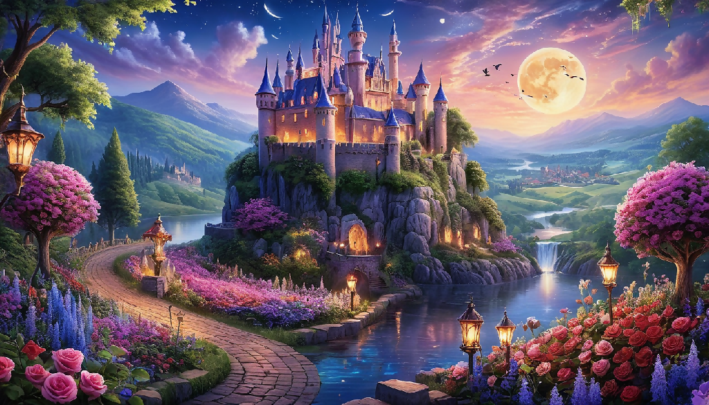 An enchanted fairy-tale castle perched atop a lush, green hill, with turrets and spires reaching towards a sky painted in hues of twilight purple and deep blue. A crystal-clear waterfall cascades down the hill, surrounded by vibrant, blooming gardens filled with roses, lilies, and wildflowers in a riot of colors. The scene is illuminated by countless fireflies and lanterns hanging from the trees, casting a warm, magical glow. A serene river winds through the landscape, reflecting the grandeur of the castle and the beauty of the surrounding nature. Swans glide gracefully on the river's surface, while the soft sound of a gentle breeze rustles the leaves of ancient, towering trees. In the background, a crescent moon rises, adding to the ethereal charm of this dreamlike, serene paradise.