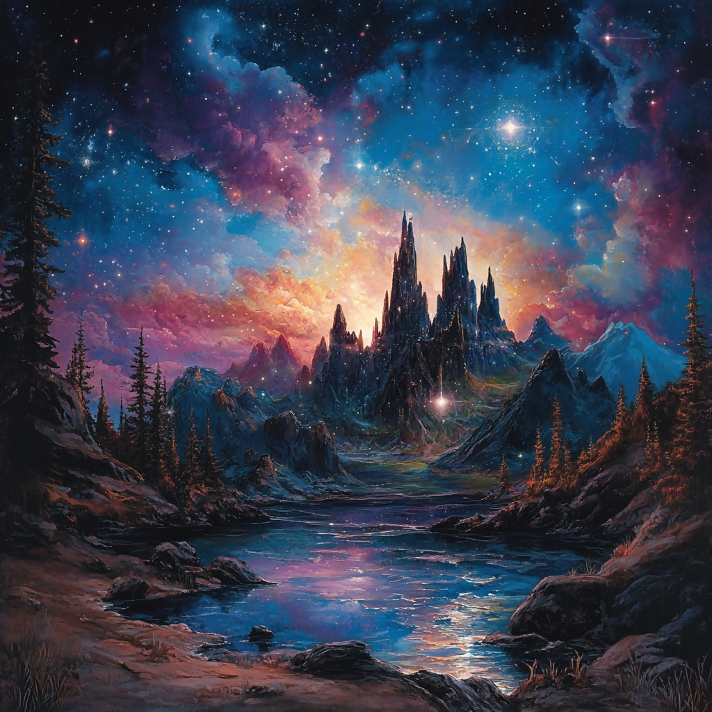 A breathtaking fantasy landscape where towering mountains rise beneath a glowing starry sky. Vivid cosmic colors blend with the serene reflection of water, creating a magical dreamlike world. Perfect for fantasy lovers, wall art, and inspirational digital prints.
