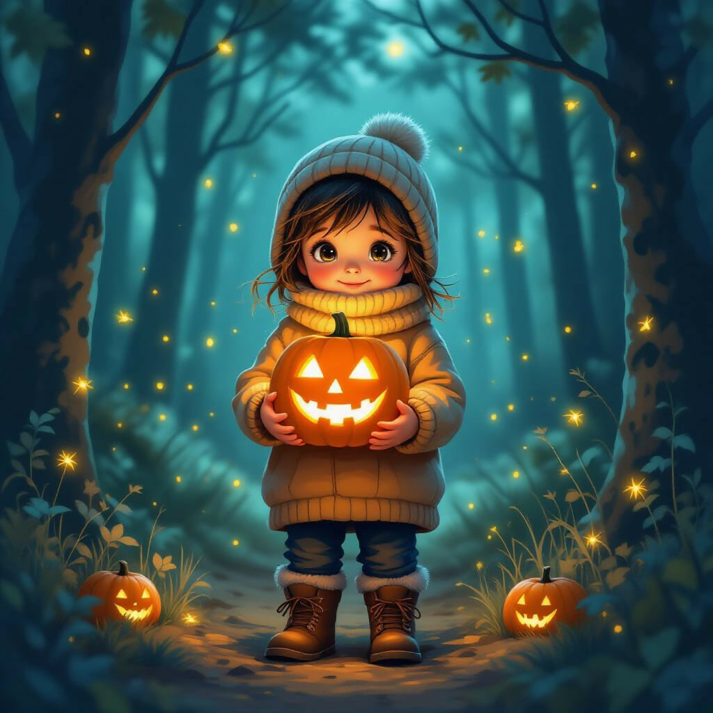 A magical image of a child with a glowing pumpkin in an enchanted forest. Fireflies twinkle, and the trees seem to whisper in this whimsical scene with soft, ethereal lighting.
