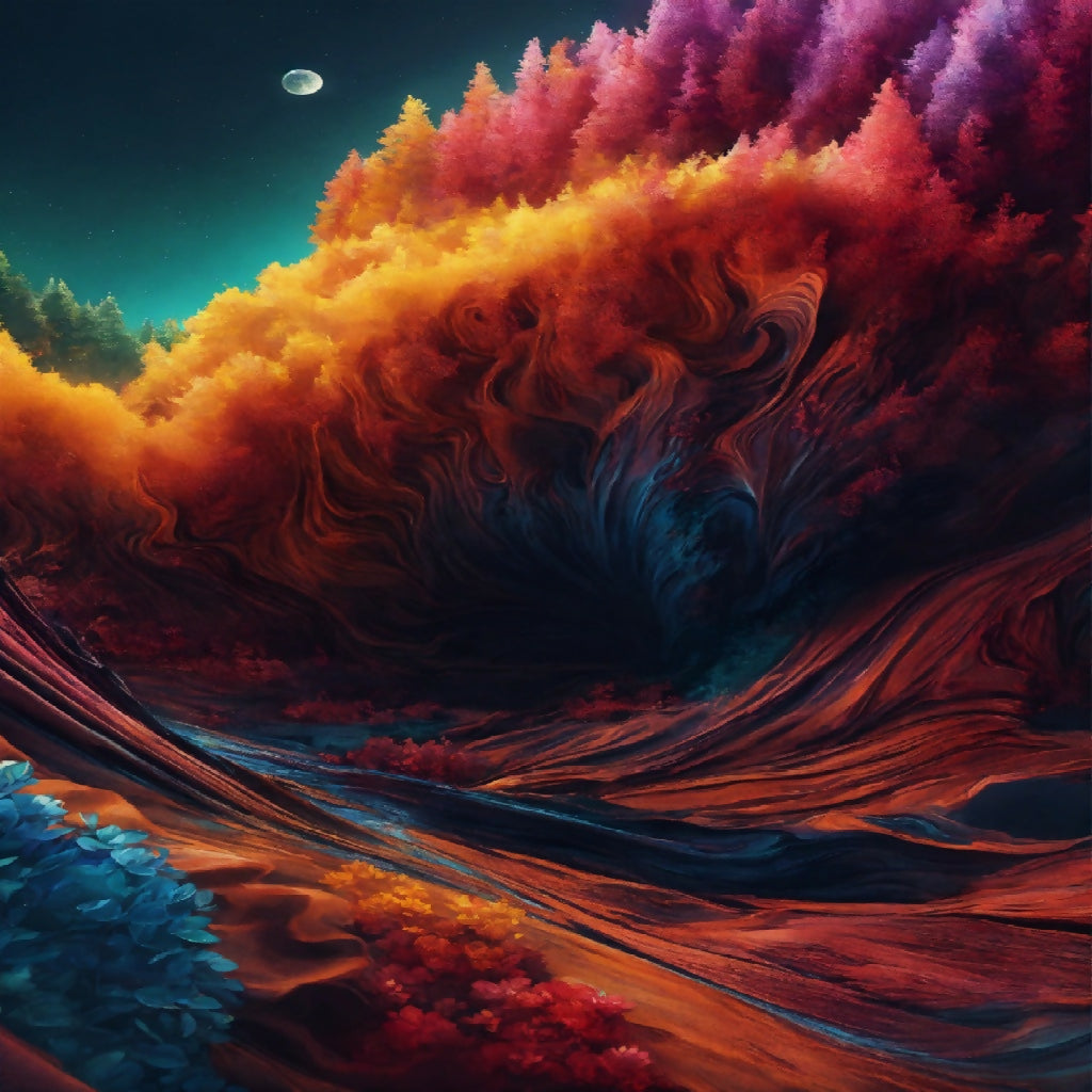 The image depicts a surreal and vibrant forest scene under a night sky illuminated by a bright moon. The forest is characterized by a stunning array of colors, with trees in shades of pink, purple, orange, and yellow. The landscape features a winding river flowing through a valley with intricate, swirling patterns in the terrain. The foreground includes blue and orange foliage, adding to the fantastical and dreamlike quality of the scene. The combination of vivid colors and the serene moonlit atmosphere makes this image both captivating and otherworldly.