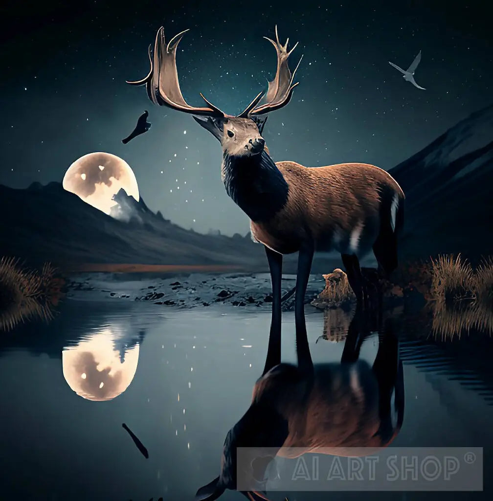 "Enchanted Lunar Antlers" is a stunning piece of artwork that captures the beauty and magic of a moonlit night. The central focus of the piece is a majestic deer with large, antlers that seem to glow in the moonlight. The antlers are adorned with delicate, intricate patterns that resemble the phases of the moon, giving them an otherworldly quality. The deer itself is depicted with a serene expression, as if it is at one with the nighttime world around it. The background of the piece is a deep, rich blue that fades into black, creating the illusion of an infinite night sky. The overall effect of the artwork is one of ethereal enchantment, as if the viewer has stumbled upon a mystical realm where the boundaries between reality and fantasy blur together.