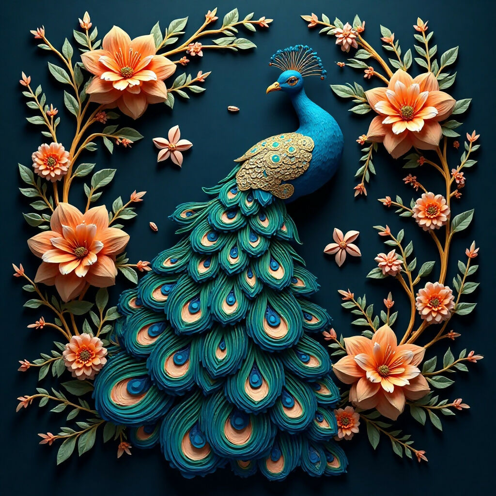 Elevate your space with this mesmerizing artwork featuring a radiant peacock surrounded by lush floral blooms. Intricately detailed feathers in rich teals and deep blues complement the warm peach and coral flowers, creating a stunning visual harmony.