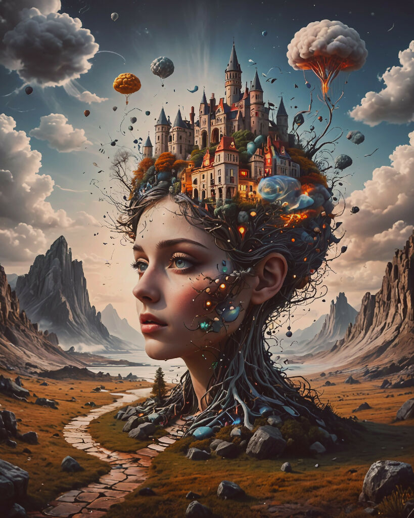 Step into a world where imagination and reality intertwine with "Enchanted Realm Mindscape." This mesmerizing digital fantasy art print showcases a breathtaking fusion of nature and architecture, all beautifully embedded within the visage of a serene maiden. Her head, a lush landscape, blossoms into a fantastical kingdom, complete with towering castles, whimsical balloons, and ethereal floating islands. This artwork is a testament to the boundless creativity of AI, capturing the essence of dreams and wonder. Perfect for those who love fantasy, surrealism, and the magic of artistic storytelling.