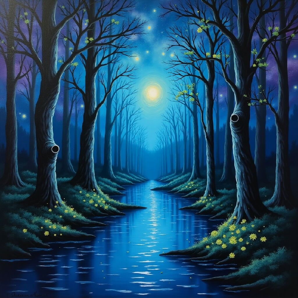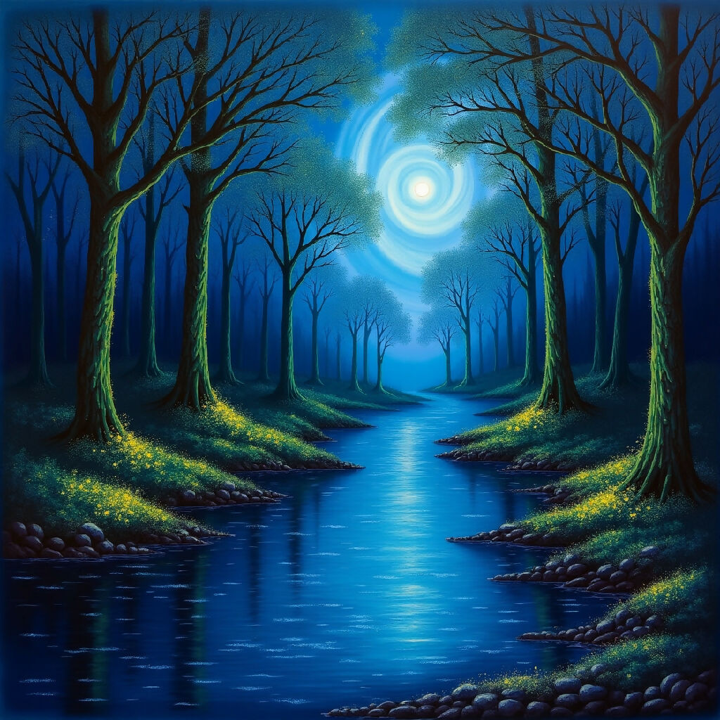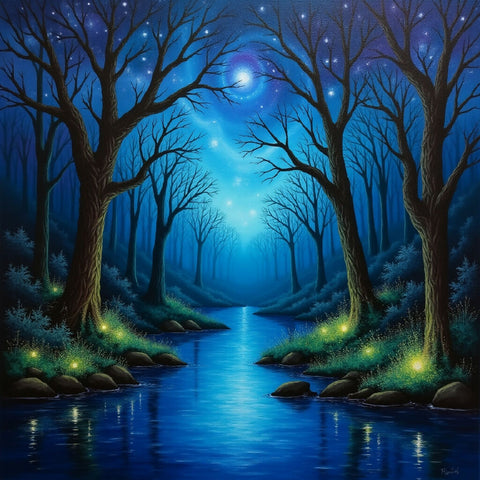 Dive into the magic of an ancient forest glowing with bioluminescent moss under a swirling starry sky. This richly textured oil-style digital painting captures the serene beauty of twilight, where nature and fantasy meet. Perfect for lovers of fantasy art, nature scenes, and dreamy landscapes. Ideal as a unique wall art piece to inspire wonder and peace.