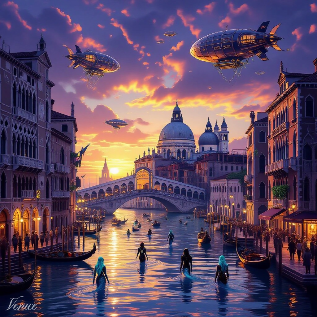 Step into the Enchanted Venetian Twilight, a mesmerising fusion of history and fantasy where the iconic Rialto Bridge glows under a vibrant purple sunset. Graceful mermaids with shimmering tails glide through the canals, their bioluminescent hues reflecting off the water, while sleek steampunk airships drift above gothic architecture.