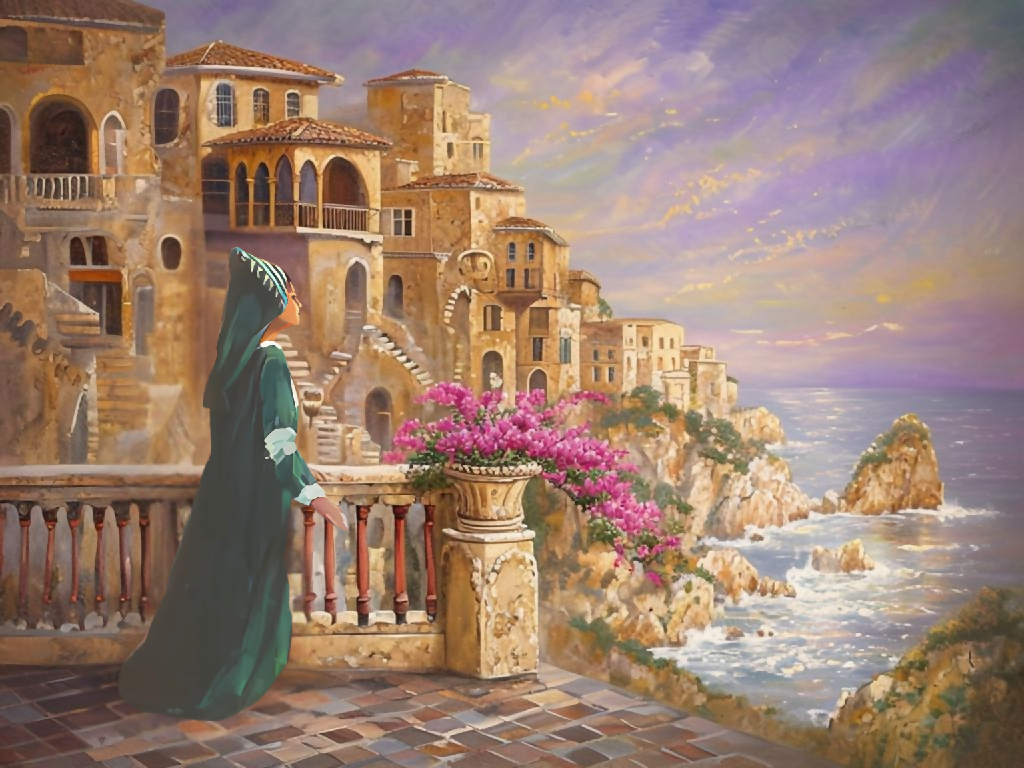 Transform your living space with this stunning digital art print, a breathtaking coastal landscape painting featuring a picturesque Mediterranean clifftop village and an elegant woman gazing at the serene ocean view. This luxury wall art piece is an instant digital download, perfect for creating a beautiful home decor aesthetic. Ideal for living room decor, bedroom interior design, or any space needing a touch of modern art and coastal decor.