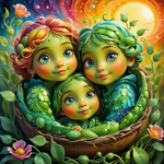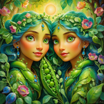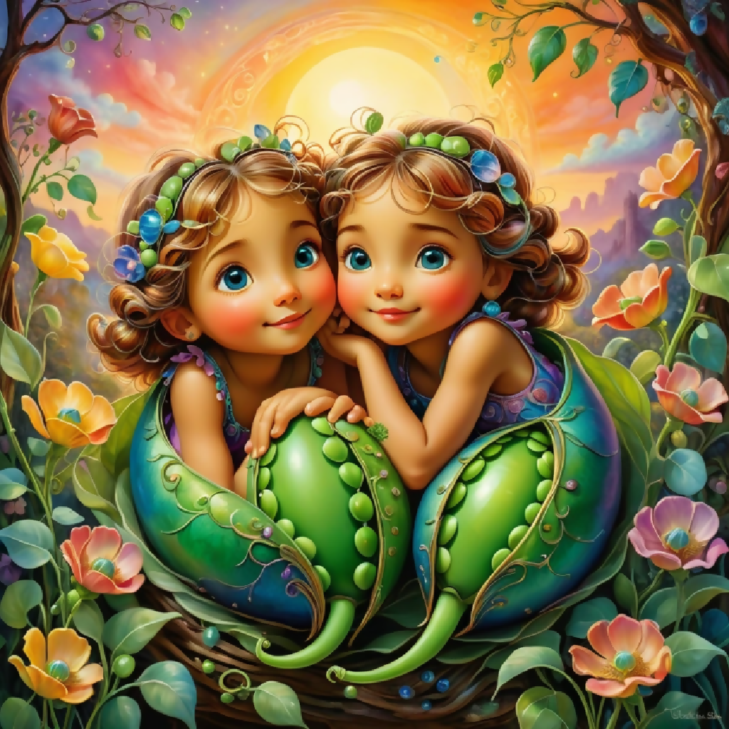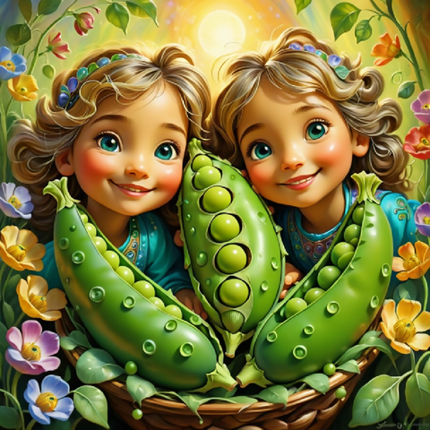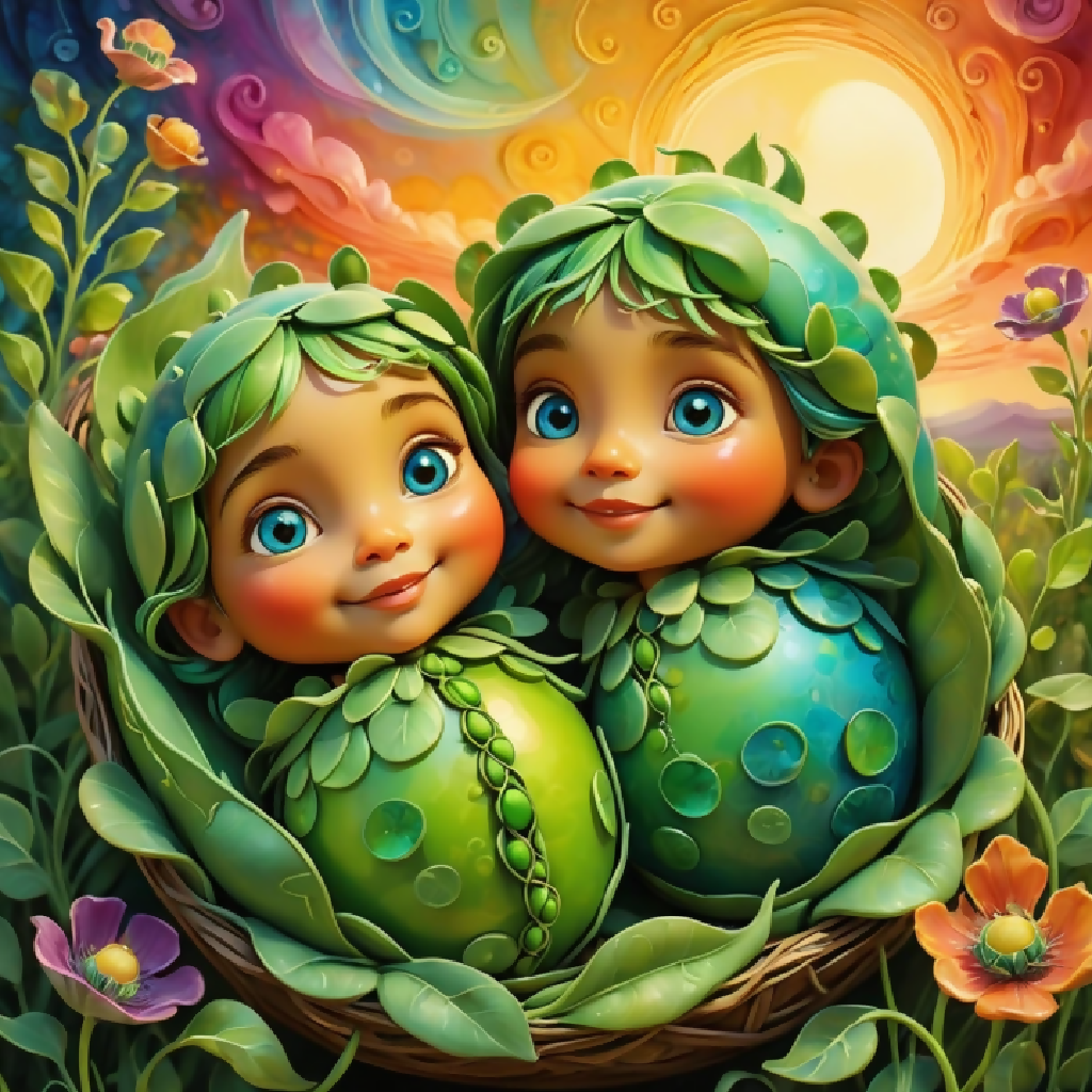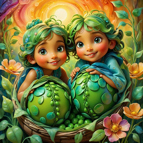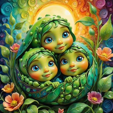 Enchanting peas snugly nestled in their vibrant green pods, their eyes filled with joy as they gaze upon the first light of a new day.