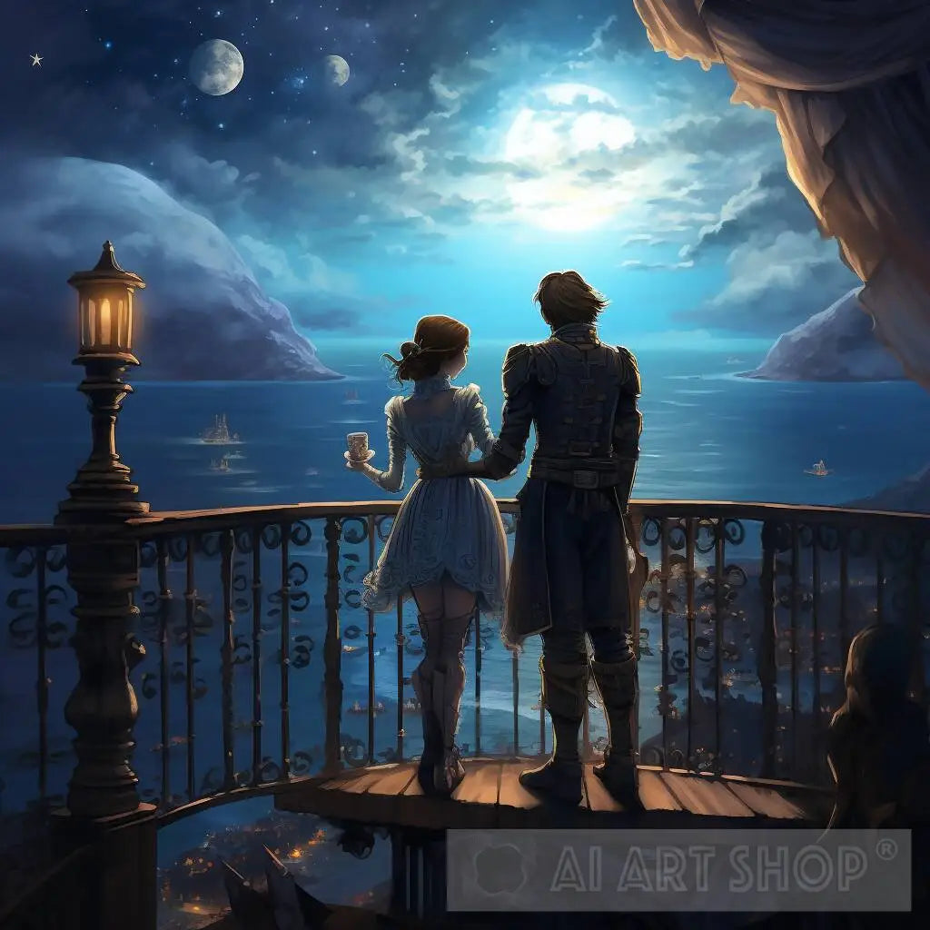 Enchanting Steampunk Romance: Handcrafted Metal Art of a Couple Strolling on Ocean-View Balcony