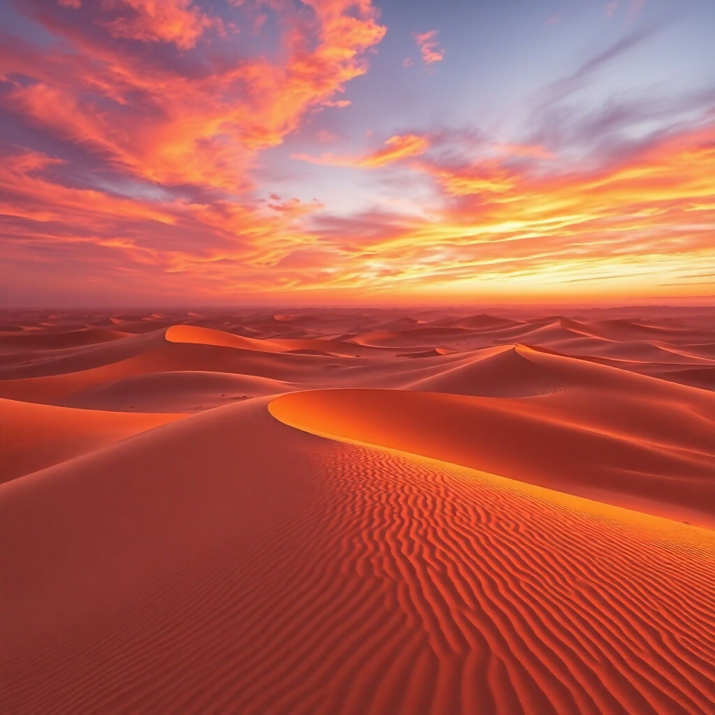 Breathtaking desert landscape featuring endless rolling sand dunes with intricate ripple patterns stretching to the horizon. A magnificent sunset paints the sky with vibrant shades of orange, pink, and purple, casting warm golden light across the sculptural dunes. The serene scene captures the timeless beauty of the Sahara.