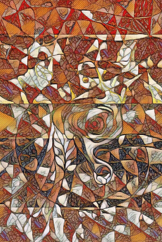 Warm colors and flowing shapes create a stained-glass inspired abstract artwork filled with motion, depth, and expressive energy.