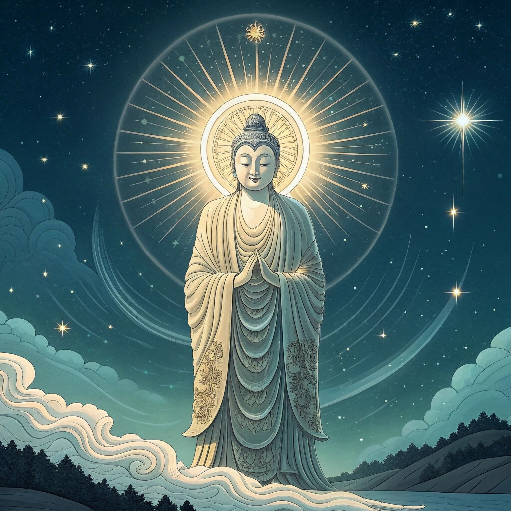 The background features a night sky dotted with numerous stars. Light trails, or streaks of light, seem to emanate from various points around the Buddha, creating an ethereal atmosphere. A bright star is prominent at the upper-right of the image.