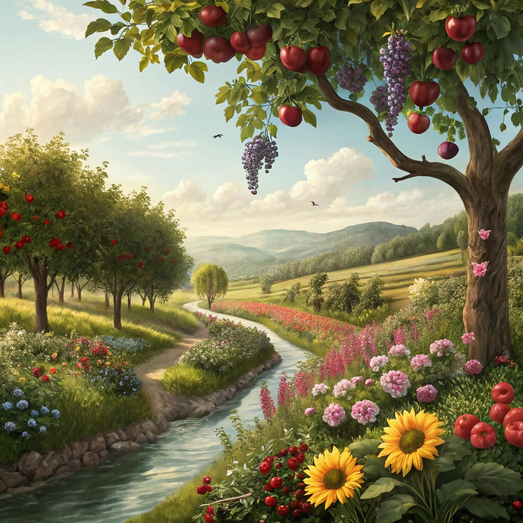 تخيل حدائق مذهلة مليئة بمجموعة من أشجار الفاكهة الوفيرة التي تحمل التفاح العصير والعنب الممتلئ والكمثرى اللذيذة، وتحيط بها الزهور النابضة بالحياة من كل لون، بما في ذلك الورود المشعة وعباد الشمس والأقحوان، مع الأنهار المتدفقة من المياه الصافية والحليب الكريمي والعسل الذهبي والنبيذ الغني، كل ذلك وسط المناظر الطبيعية الخضراء المورقة من التلال المتدحرجة والأشجار الشاهقة، تحت سماء مشرقة ومشمسة مع بضع سحب بيضاء منتفخة، حيث يكون الهواء حلوًا برائحة الزهور المتفتحة وصوت تدفقات المياه اللطيفة، مما يخلق جوًا هادئًا وشاعريًا.