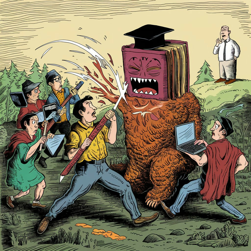 Dive into the whimsical world of "Epic Battle of Knowledge," a humorous and creative illustration that depicts a group of scholars in a fierce yet amusing combat against a monstrous book creature. The artwork brilliantly captures the struggle between traditional and modern education tools, with characters armed with pencils, books, and laptops. Perfect for educators, students, and anyone with a love for learning and laughter.