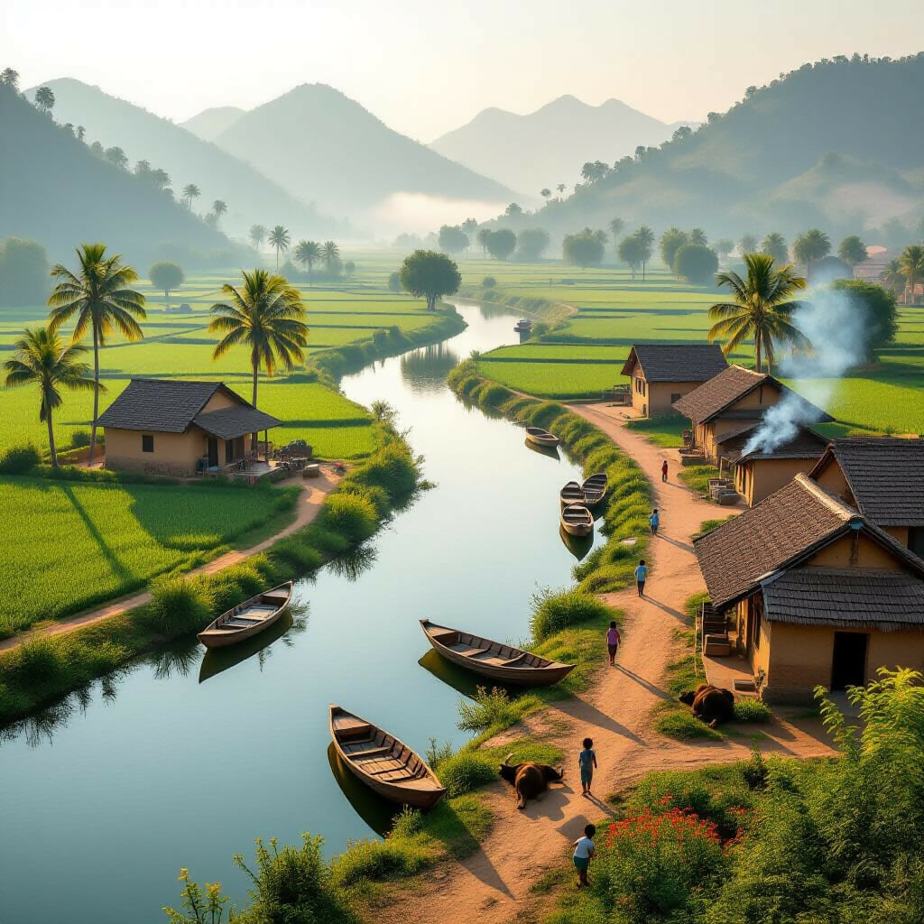 A stunning rural countryside landscape featuring a crystal-clear river, lush green fields, traditional clay houses, wooden boats, tall palm and neem trees, and majestic fog-covered hills glowing under warm golden sunlight. This artwork captures the peaceful beauty of village life with cinematic realism and soothing natural colors. Perfect for wallpapers, posters, digital prints, and nature-inspired