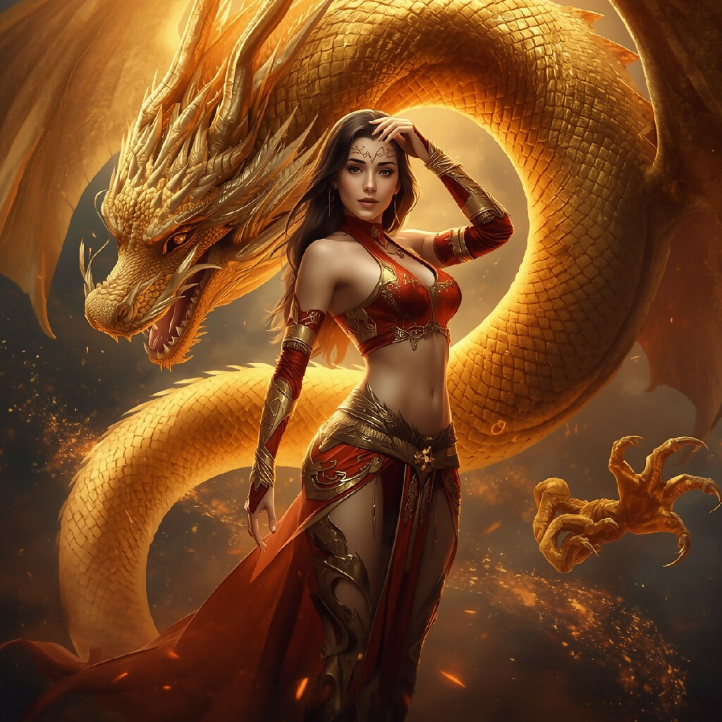 Epic fantasy artwork of a majestic golden dragon wrapping around behind a beautiful woman. The woman stands in a confident pose, body slightly turned, one arm bent and raised while looking forward. She wears a red mystical warrior outfit with golden details, glowing sparks around her, cinematic lighting. The dragon is large, detailed, with golden scales and fiery aura, positioned closely behind her head, mouth slightly open, creating a dramatic background. Ultra realistic fantasy style, high resolution, glowing atmosphere. No text, no logos, no symbols, no balls.
