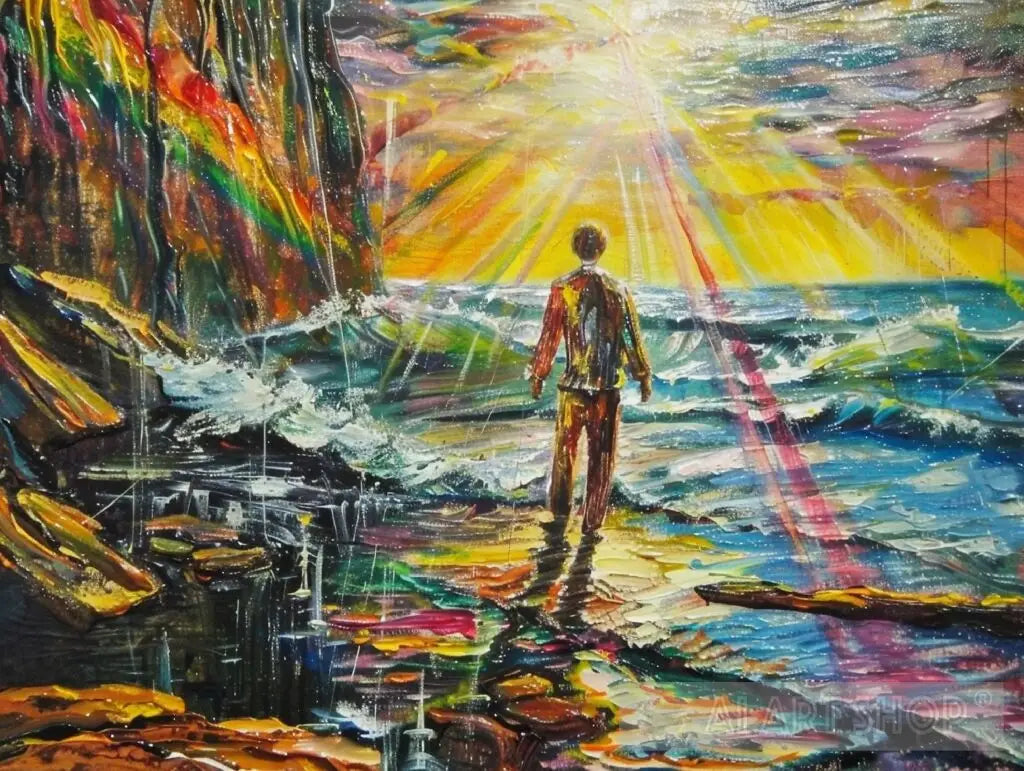 This vibrant painting captures a moment of introspection as a lone figure stands on a rocky shore, gazing out at the sea and the brilliant sunset. The artwork is awash with color, from the swirling, multicolored cliffs to the iridescent waves and the radiant beams of sunlight breaking through the sky. The dynamic brushstrokes and rich, textured layers create a sense of movement and energy, reflecting the raw power and beauty of nature. The figure's presence adds a contemplative element, inviting viewers to ponder the relationship between humanity and the natural world