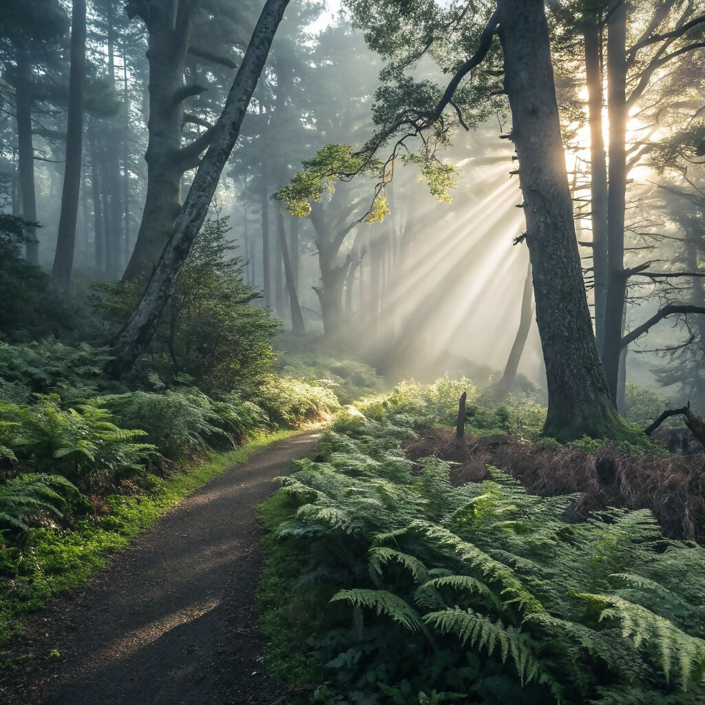 Sunlight streams down through the thick canopy of trees, creating shafts of light that pierce the fog. The path, a light brownish-gray dirt, gently slopes upward, bordered by lush ferns and other greenery.