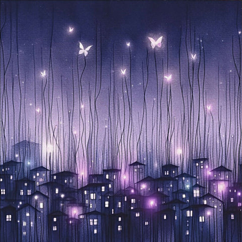 Escape of Spouls” portrays a magical night scene. Quaint houses emit a soft purple glow, suggesting life within their walls. The entire tableau evokes serene magic and the quiet thrill of unseen worlds coming alive under the cover of night.