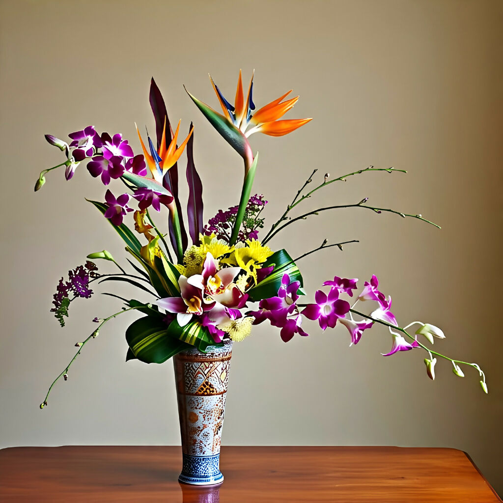 Step into a timeless moment with Eternal Bloom, a stunning AI-generated still life that celebrates the delicate harmony of nature and design. This artwork captures a vibrant bouquet—featuring Bird of Paradise, orchids, chrysanthemums, and lilies—arranged in a regal, hand-painted vase. Each petal and leaf is rendered with precision, echoing the elegance of classical still life while embracing the boldness of modern digital artistry.