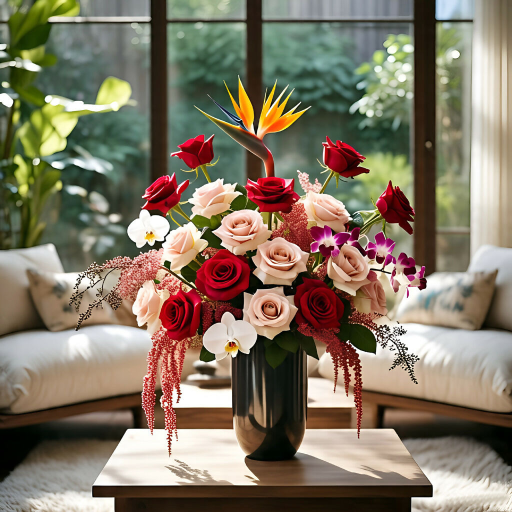 Step into a moment of timeless elegance with Eternal Bloom, a digitally crafted still life that celebrates nature’s grandeur within a serene, upscale interior. This AI-generated artwork features a lavish bouquet of deep red and blush roses, cascading amaranthus, and exotic orchids, crowned by a majestic Bird of Paradise. Set against plush white sofas and sunlit windows, the scene evokes a quiet luxury—where every petal whispers stories of love, celebration, and fleeting beauty preserved forever.