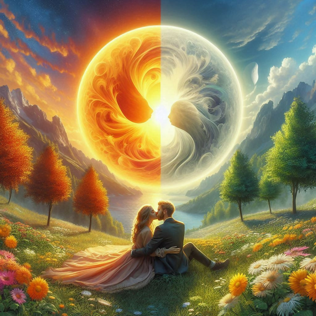 Step into a world where time stands still and love transcends the cosmos with Eternal Eclipse. This mesmerizing masterpiece captures the Sun and Moon in a rare celestial waltz, their luminous auras bathing a dreamlike meadow in hues of amber and twilight. At the center of this idyllic paradise, a real couple sits entwined on a velvety carpet of emerald grass, their passionate embrace and gentle kiss framed by a kaleidoscope of blooming wildflowers.