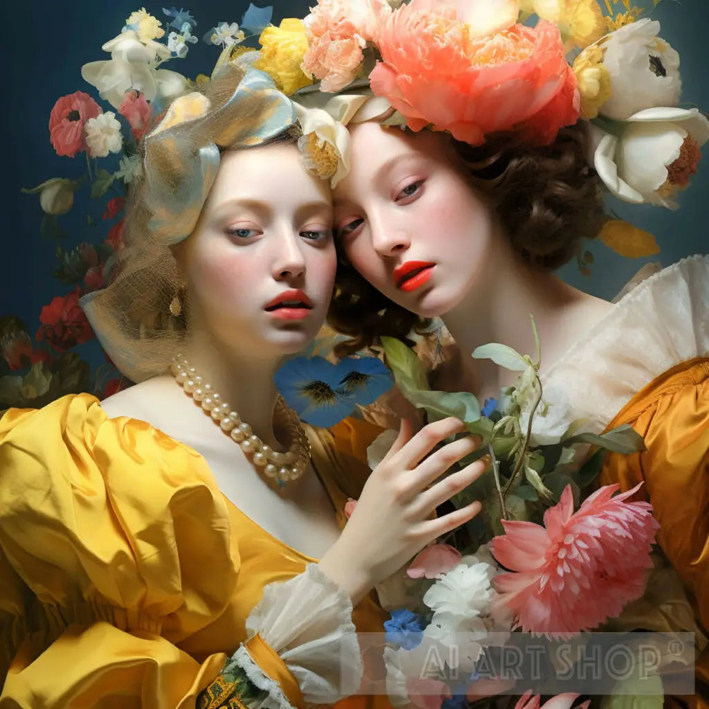 This exquisite digital painting portrays two ethereal young women adorned in lavish 18th-century attire, their faces softly illuminated against a dark, richly colored background. Their delicate expressions and gentle poses evoke a sense of intimacy and grace. One wears a vibrant yellow dress complemented by a pearl necklace, while the other is draped in a soft white gown with a floral headdress. The intricate details of the flowers surrounding them, coupled with the use of soft lighting and shadows, create a dreamlike, almost surreal atmosphere that captures the timeless beauty and elegance of the subjects
