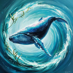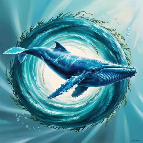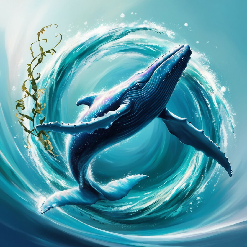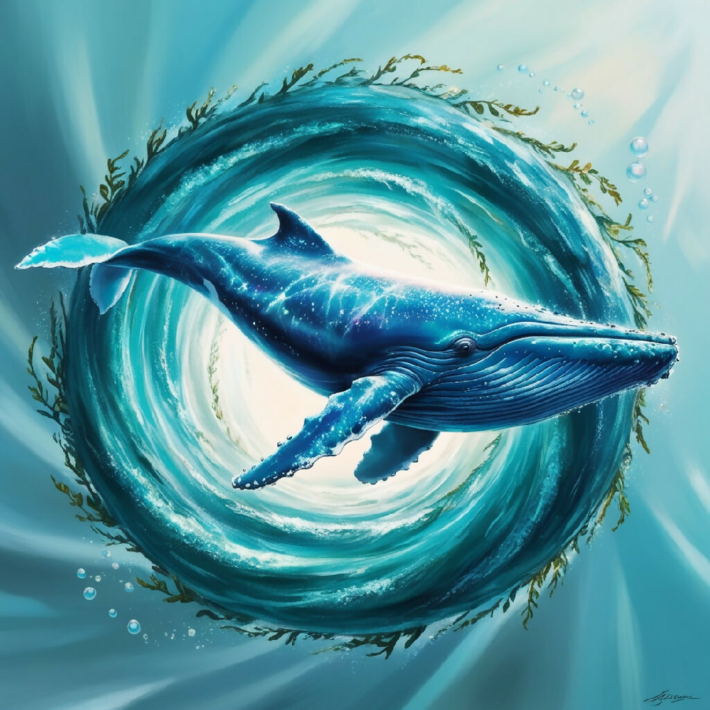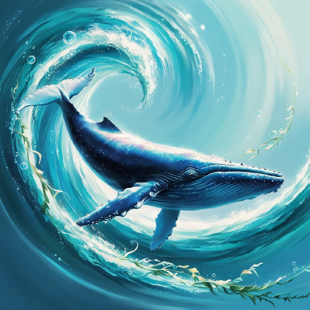 A majestic blue whale, rendered in vibrant digital art, swims through a swirling vortex of turquoise and aquamarine hues, its massive body glistening with iridescent scales that shimmer like stardust in the soft, ethereal lighting. The background blends into a soft, gradient blue, evoking the mystery of the deep ocean, while delicate seaweed strands and bubbles dance around the whale, adding a touch of whimsy to this cinematic, dreamlike scene, bursting with blues and greens that evoke a sense of wonder and magic. in short