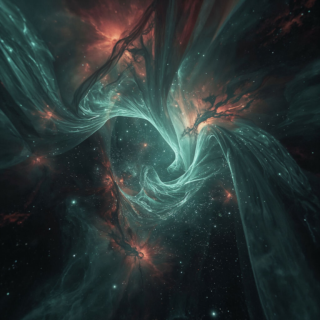Translucent veils of turquoise and coral flow through star-scattered space, creating organic forms that pulse with life-like movement. These gossamer membranes suggest cellular division or cosmic birth, their flowing edges defining spaces both protective and permeable. The interplay of warm and cool tones evokes the delicate balance between creation and dissolution. Stars pierce through the translucent layers like distant memories or future possibilities. This composition explores themes of metamorphosis and becoming, where boundaries dissolve and new forms emerge from the intersection of opposing forces. The flowing forms speak to life's essential fluidity and constant transformation.
