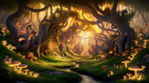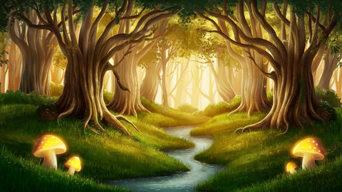 A magical forest scene with tall, ancient trees whose branches are intertwined, creating a canopy that filters golden sunlight. Add whimsical elements like glowing mushrooms, and a gentle stream winding through the trees.