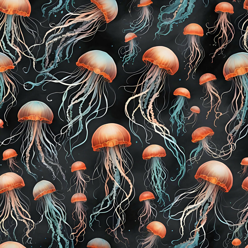 Immerse yourself in the tranquil beauty of "Ethereal Glow of the Deep," an enchanting AI-generated artwork that captures the elegance of jellyfish as they float serenely in the dark ocean depths. Each jellyfish radiates luminescent hues of orange and blue, with their delicate, flowing tentacles creating a mesmerizing spectacle. This stunning piece beautifully conveys the mystery and grace of marine life, making it an ideal addition to contemporary spaces, marine-themed decor, or art collections that celebrate the wonders of nature