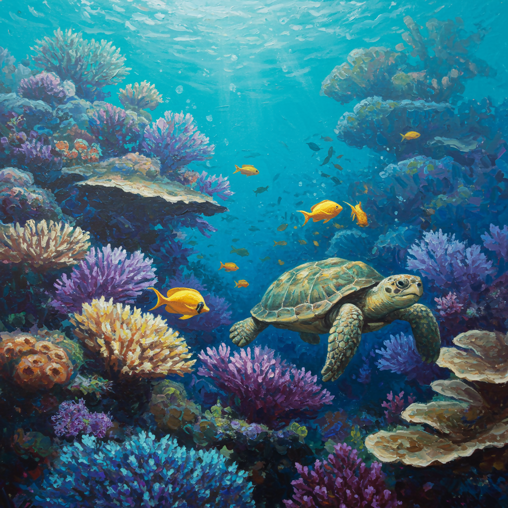An ethereal and serene marine life study with coral reefs, fishes and tortoise.