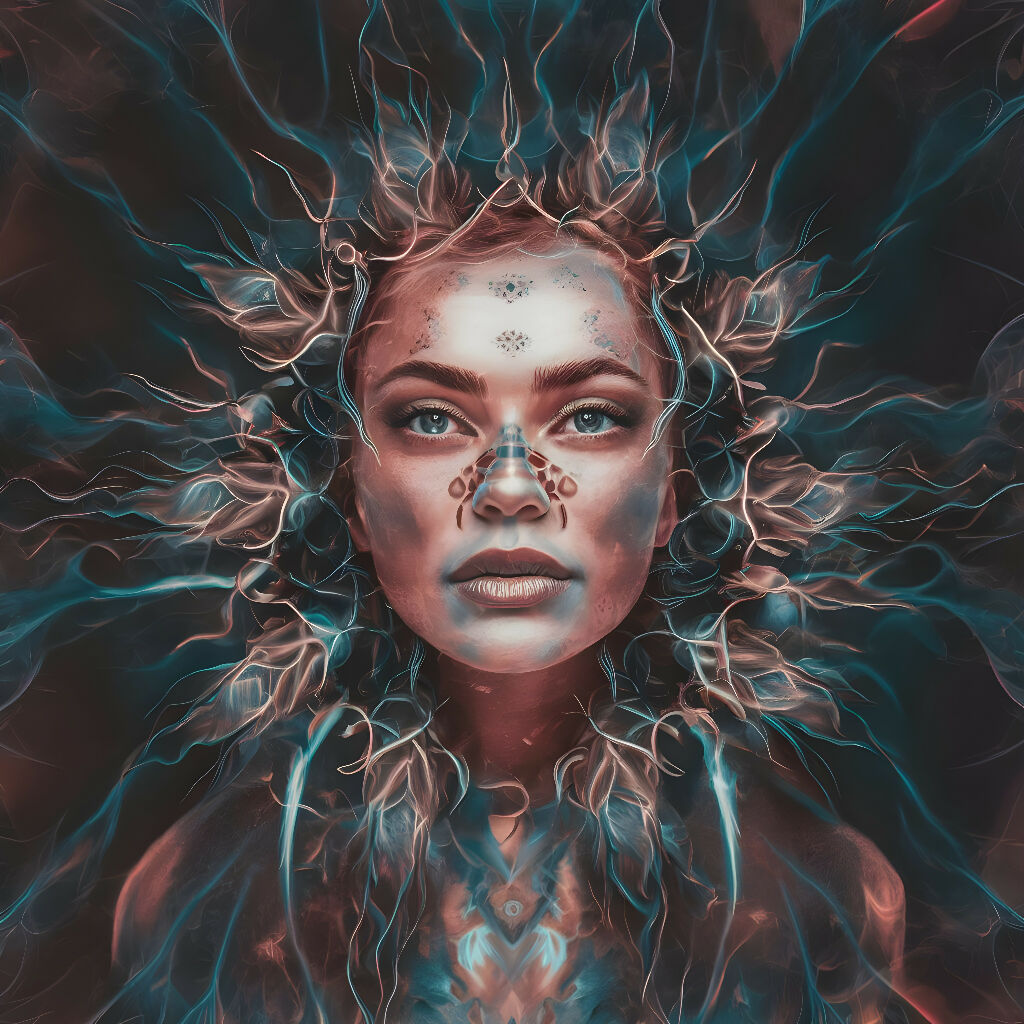 Immerse yourself in the captivating beauty of "Ethereal Nexus," a mesmerizing digital artwork that blends the realms of nature and technology. This piece features a striking visage adorned with intricate, organic patterns, evoking the essence of a digital deity. The ethereal glow and vibrant hues create a sense of otherworldly energy, drawing viewers into a cosmic dance of light and form. Perfect for adding a touch of futuristic elegance to any space, "Ethereal Nexus" invites you to explore the limitless possibilities of AI-generated art.