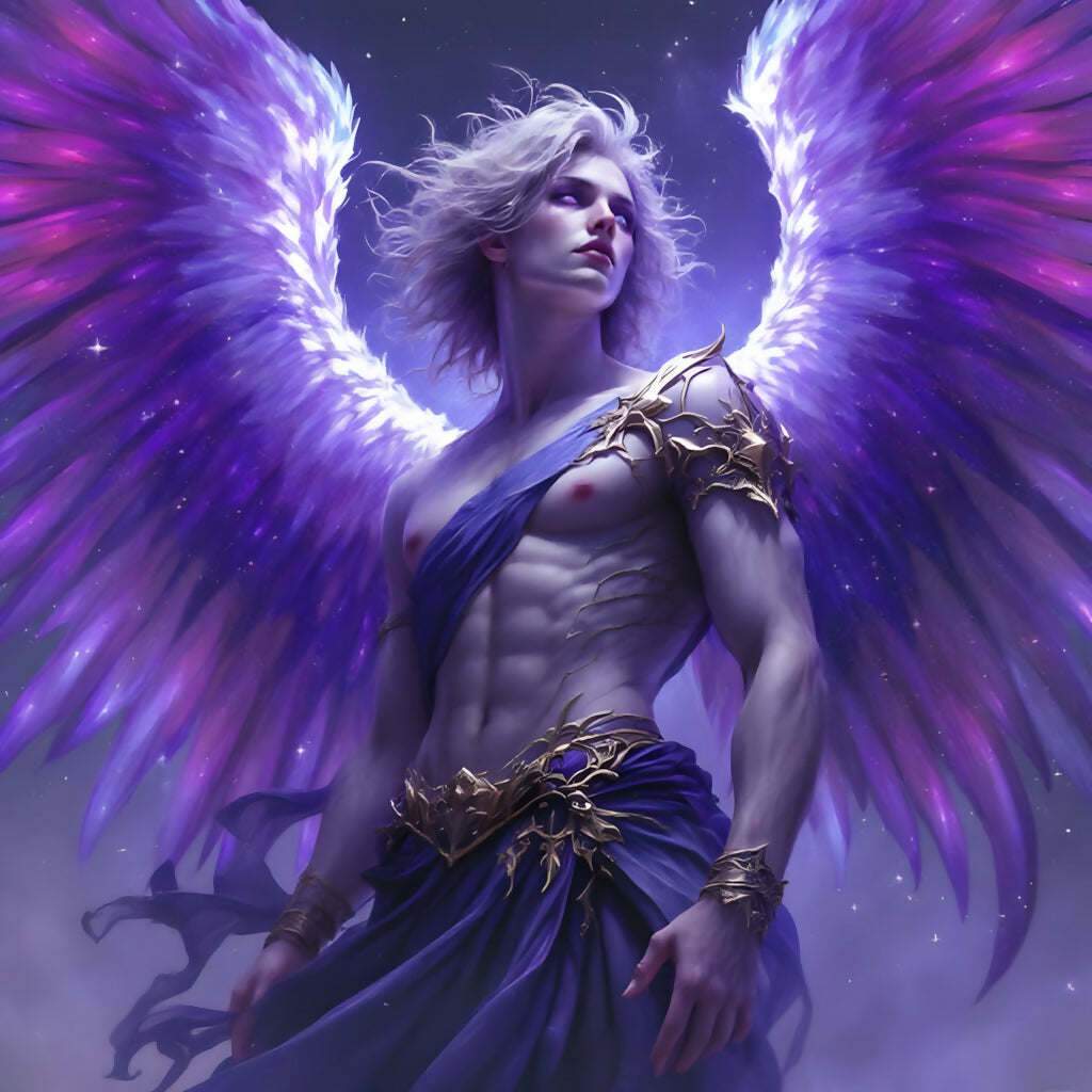 A striking vision of divine masculinity, this angelic warrior stands poised against a star-dusted sky. With glowing violet wings and golden armor, he embodies both strength and serenity. His gaze is distant, as if guarding the mysteries of the cosmos.