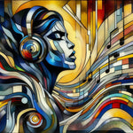 This abstract oil painting captures a woman deeply connected to the rhythms, embodying the soul of sound with vibrant and dynamic strokes. With a modern twist, it intertwines the essence of music and art, creating a mesmerizing portrayal of rhythmic immersion.