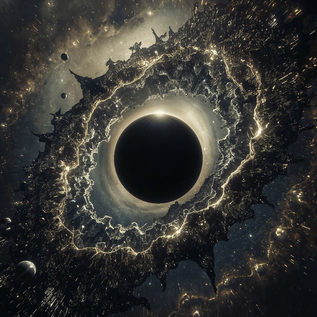 A perfect black void dominates the composition's center, surrounded by a crown of jagged, golden-edged destruction. Debris and energy streams radiate outward in violent patterns, suggesting cosmic catastrophe frozen at the moment of impact. The stark contrast between the absolute darkness of the central sphere and the chaotic brilliance surrounding it creates a meditation on creation and annihilation. Smaller celestial bodies drift in the periphery, witnesses to this cosmic drama. The image captures the paradoxical beauty of destruction, where ending and beginning occupy the same eternal moment, and nothingness becomes the source of infinite possibility.