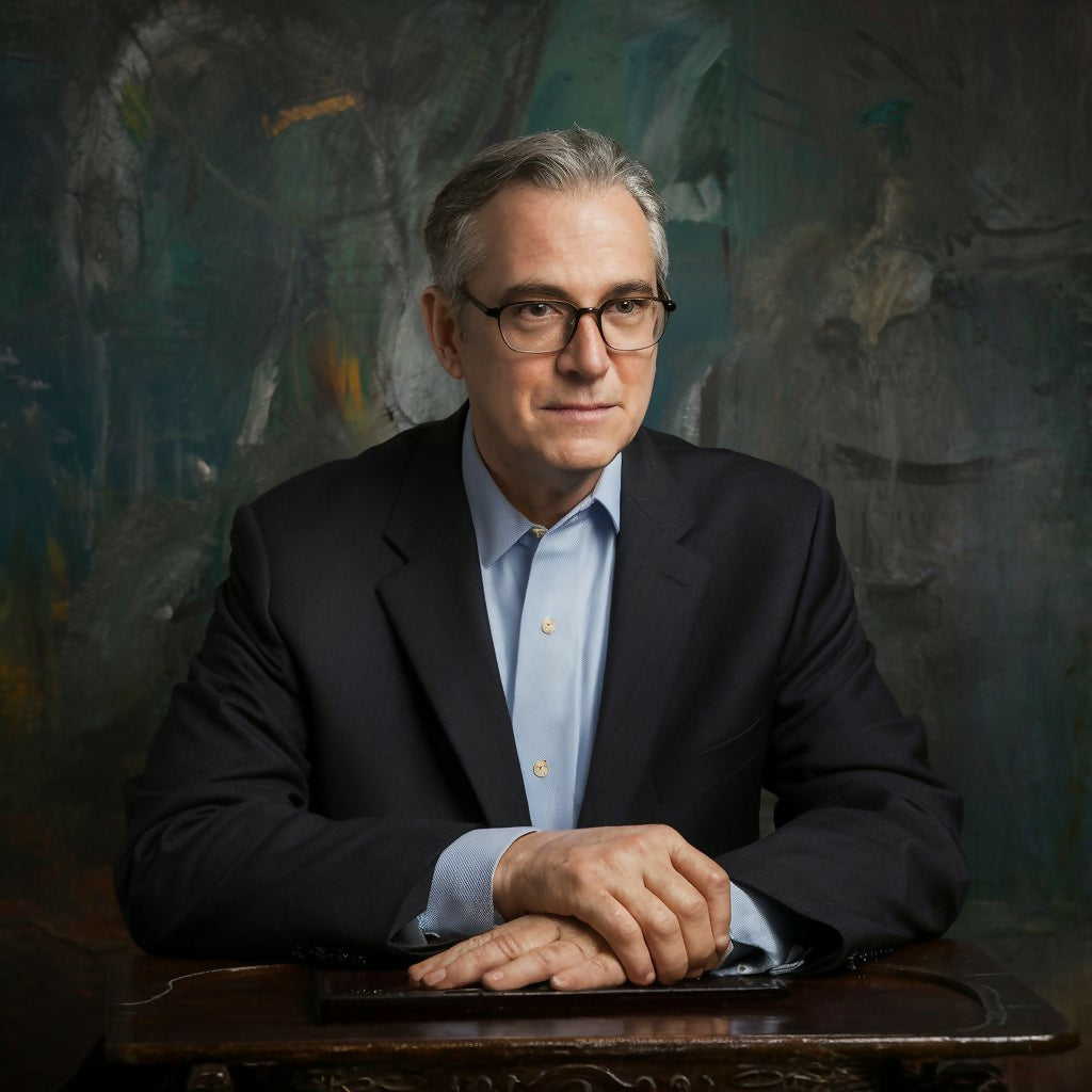 This striking portrait captures a distinguished gentleman in a professional setting. The subject is a middle-aged man with gray hair and glasses, wearing a dark suit and light blue shirt. He's seated at a wooden table or desk, hands clasped in front of him, exuding an air of confidence and expertise. The background features an abstract painting with muted green and gray tones, adding depth and artistic flair to the composition.