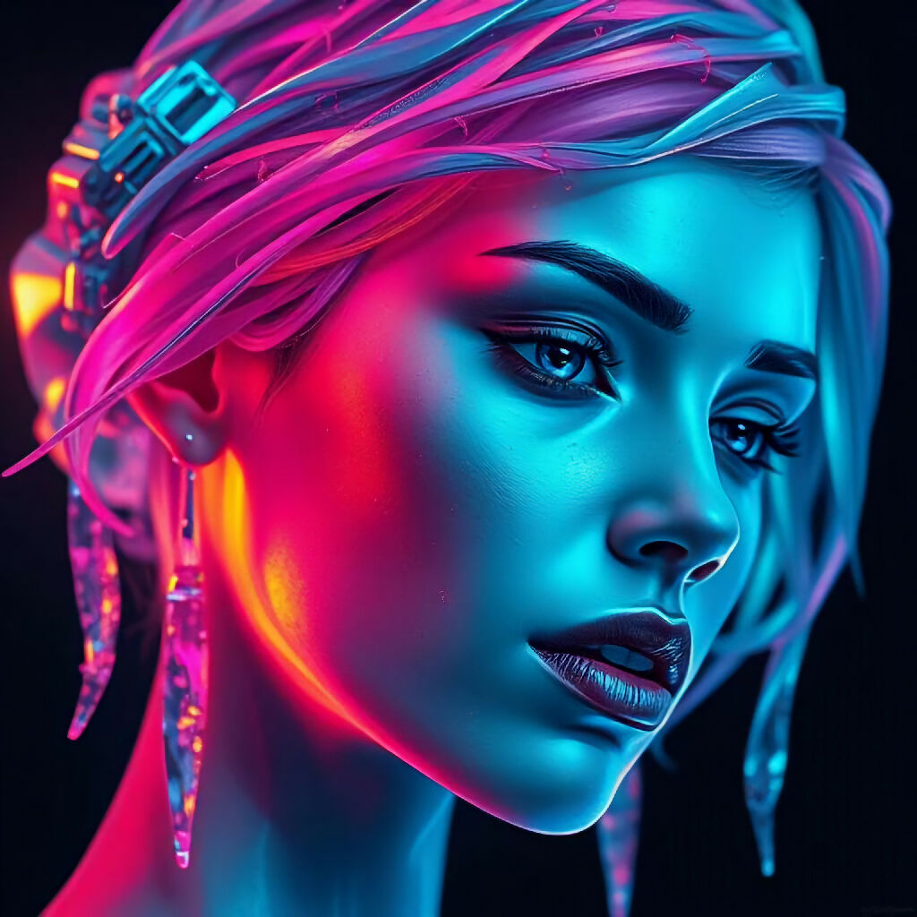 "Exotic Beauty" captures the allure of a captivating, mysterious woman in a striking side profile. Her thoughtful gaze draws you in, while vibrant neon lights cast mesmerizing reflections on one side of her face. The intensity of her expression, combined with the bold, colorful glow, makes this artwork an unforgettable exploration of beauty, intrigue, and elegance.