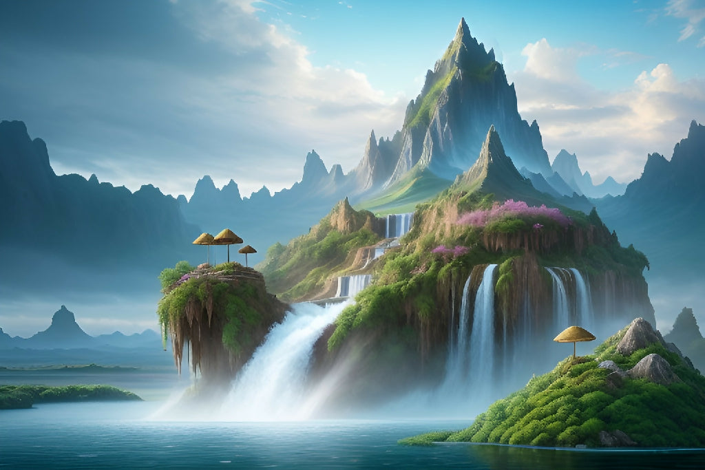 The image features a stunning waterfall cascading down a cliff, surrounded by breathtaking natural scenery. The landscape includes majestic mountains and a vibrant sky adorned with clouds. This outdoor setting captures the beauty of nature, highlighting the movement of water as it flows over the rocky precipice.